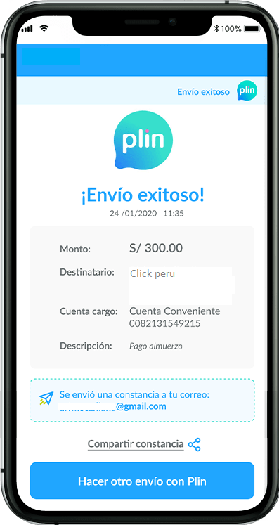 - Recibirás una confirmación en la aplicación Plin una vez que la transacción se haya completado correctamente.